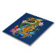 A green Chinese dragon with an orange koi fish with lotus flowers and cherry blossoms against a backdrop of dark blue.