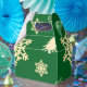 A colorful Christmas gift box featuring a pattern of cream snowflakes, Christmas trees and swirls scattered over a traditional green Christmas background to add a touch of class and style to your Christmas gift giving this year.