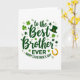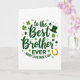 This card features a St. Patrick’s Day greeting on a white background, built around a brotherly bond shown through warm, welcoming lettering and lucky symbols 💚. The main line, “to the Best Brother Ever,” sits prominently in the center, with “Best” and “Brother” in large emerald green flowing letters that feel like a friendly shout-out. “to the” appears smaller in green above, while “EVER” is set in uppercase nearby, and “HAPPY ST. PATRICK’S DAY” is placed below in a neat uppercase style for contrast. Around the words, clusters of three-leaf clovers in forest and lime green scatter like confetti, adding a cozy, close-knit feel. A dark green leprechaun hat with a gold buckle rests at the upper right, tipping the scene toward classic holiday charm ☘️. At the lower right, a golden horseshoe with darker dot accents anchors the corner and echoes the gold details in the hat. Tiny green asterisks and cross shapes are sprinkled through the open space, filling the layout with small celebratory marks.