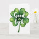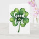 This card features a large four-leaf clover painted in layered watercolor greens, floating on a bright white background for a fresh, open look 💚. The leaves shift from light yellow-green highlights to deeper emerald shadows, giving them a rounded, almost touchable depth. Across the center of the clover, the words “Good luck” appear in flowing white lettering that follows the curve of the leaves without covering their shape. The smooth strokes of the text feel like a gentle note passed between close friends, tucked right where your eyes naturally land. Near the stem, a smaller three-leaf clover sits quietly, like a sweet companion beside the main one ☘️. Soft edges and subtle speckles in the paint add texture, as if the color has settled naturally into the paper. The stem angles slightly downward, and the tiny clover is nestled just to one side near its base.