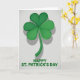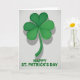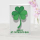 The front design shows a single three-leaf clover centered on a light grey background, like a quiet little token meant for someone special 💚. The shamrock is shaded in deep emerald and leafy greens, with gentle gradients that make each heart-shaped leaf look softly rounded. A slim stem curves slightly, giving the clover a graceful, almost shy posture, as if it’s leaning in close. Beneath it, a faint, diffused shadow makes the clover appear to float just above the surface, adding depth without making the scene feel heavy. Near the bottom, the phrase “HAPPY ST. PATRICK’S DAY” sits in uppercase letters, aligned neatly and colored to match the clover’s green. The open space around the design keeps the focus on that single symbol, like a small gesture of friendship offered without fuss ☘️. The greens stand out against the pale grey, and the shadow falls as a soft oval directly under the clover.
