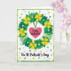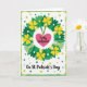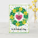 On the front of the card a circular wreath sits in the center, built from layered green leaves and yellow four-leaf clovers that curl neatly around each other ☘️. Nestled inside the ring hangs a fuchsia-pink heart like a small charm, giving the scene a sweet, close-to-the-chest kind of romance. The words “To My Girlfriend” sit on the heart in a flowing dark ink, drawing your eye straight to the message. Just below that, “On St. Patrick’s Day” appears as a smaller line of text, placed near the lower center in green to match the foliage 💚. The greens shift from deep emerald to light lime, while the clovers add sunny yellow highlights that keep the wreath lively. All of it rests on a white background sprinkled with small green and yellow polka dots that drift around the center like confetti. A gently wavy double border in green frames the whole layout, echoing the wreath’s curves.