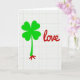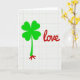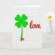 This card shows a bright green four-leaf clover on the left, glowing like a lucky charm against a pale gray grid background. Each leaf has a rounded, heart-like shape, giving the clover a gentle, affectionate look 💚. A thin green stem drops downward and ends in a stylized root system colored deep red, like a little tangle reaching toward someone nearby. On the right, the word “love” is written in flowing red lettering, positioned to face the clover as if the two are quietly drawn to each other ☘️. The red text sits about mid-height and balances the clover’s weight, with the root-red echoing the same color for a tied-together feel. The contrast between the smooth green shapes and the looser red lettering makes the layout feel like a soft exchange between friendship and romance. Behind everything, the light gray grid stays subtle and even, with thin lines that keep the background orderly and calm.