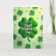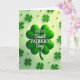This greeting card features a large four-leaf clover centered on the front, shaded in rich greens that shift from bright emerald to deeper forest tones along the curves. The clover looks softly rounded and slightly glossy, like it’s catching light as you tilt it, giving the scene a cozy, close-up feel 💚. Across the clover’s broad leaves, the message “HAPPY SAINT PATRICK’S Day” sits in white lettering with a faint shadow, stretching neatly across the middle where your eye naturally lands. Behind it, the background fades from a warm lime green near the top to a cooler mint green toward the bottom, like early spring air settling into evening. Small clovers float throughout the backdrop in a blurred, bokeh-style scatter, adding depth the way distant lights soften in the background of a photo ☘️. The crisp central clover against the hazy field of tiny shapes creates a gentle, affectionate focus—like two friends leaning in for a shared laugh, with everything else falling away. The main clover remains sharply detailed while the surrounding clovers stay softly out of focus, sprinkled across the gradient like green confetti.