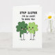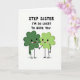 This greeting card features a bright white background with the message “STEP SISTER I’M SO LUCKY TO HAVE YOU” set in large black letters near the top, easy to spot at first glance. Beneath the text, two four-leaf clovers stand side by side in two greens—one deeper emerald and one lighter lime—like a pair that naturally belongs together. Each clover has simple black dot eyes, a friendly smile, and soft pink cheeks, and their faces tilt toward one another with an affectionate, knowing look 💚. Thin black arms and legs extend from their bodies, and their hands meet in the middle, suggesting a close bond and steady support. The minimal linework keeps the focus on their expressions and the gentle closeness of their pose. The black lettering stays centered above them, while the clovers anchor the lower portion of the design, leaving plenty of airy space around the art. Both clovers are outlined in black, with the emerald one on the left and the lime one on the right, their joined hands forming a small focal point between them ☘️.