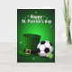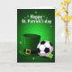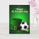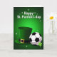 This greeting card features a festive St. Patrick’s Day scene in layered greens, fading from bright lime near the center to deep emerald around the edges. At the top, “Happy St. Patrick’s Day” sits in crisp white lettering, centered and easy to spot against the green glow. Below the text, a deep forest-green leprechaun top hat leans close to a black-and-white soccer ball, like two friends posed side by side for a photo 💚. The hat’s golden buckle catches the light, adding a warm gleam that draws your eye toward the middle of the design. A small four-leaf clover in fresh green peeks out from under the soccer ball, tucked in as a lucky little detail ☘️. Tiny white asterisk-like sparkles scatter across the background, giving the space a light, celebratory shimmer. Soft shadows sit beneath the hat and ball, helping them stand out clearly from the glowing green backdrop.