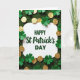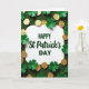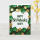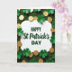 This card shows a white rectangle with softly rounded corners centered on a bright green, grass-like surface, surrounded by scattered gold coins and four-leaf clovers ☘️. The greeting sits in the middle, with “HAPPY” at the top and “DAY” at the bottom in deep emerald green all-caps, while “St Patrick’s” runs between them in a flowing green style that feels a bit like a gentle hand-signed note. The coins glint with a light metallic shine, and their placement around the card reads like little gifts dropped along the edge, as if someone is leaving a trail for a friend to follow. Smooth green clovers tuck into the corners and sides, leaning toward the message the way close friends lean in for a photo. The even lighting keeps the greens rich and the gold warm, giving the whole scene a cozy, close-together look 💚. The layout frames the words clearly, with the clovers and coins forming a loose border that guides your eyes back to the center. Against the textured green background, the white card stands out sharply while the gold coins and clovers cluster most densely along the lower edge and right side.