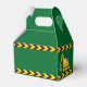 Cool custom construction excavator birthday party favor boxes in green for a child who loves yellow construction vehicles. Fun vehicle favors for a little boy who loves cars and trucks. Customize with your kid's name between the black and yellow caution tape.