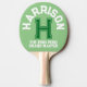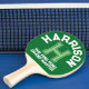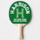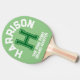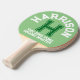 Personalized ping pong paddle with your name and family name initial and team or slogan in white, green and dark green, one side has background in dark green the other in mid green. Reads Harrison H The ping pong grand master. Personalize this bold sports style paddle with your own name and initial and team name or add a slogan. Designed by www.mylittleeden.com on zazzle.