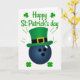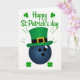 This card shows a midnight-blue bowling ball at the center, topped with an emerald leprechaun hat that feels like a fun nod shared between friends 💚. The hat has a black band and a gold buckle, sitting snugly as if it’s been set there with a grin and a gentle nudge. The background stays bright white, keeping the focus on the ball and hat like a simple stage for the joke. Above the image, the words “Happy St. Patrick’s day” curve in green lettering, with small shamrocks tucked to either side ☘️. Short green rays fan out from the hat’s brim, adding a spark of motion like a quick celebratory burst. Two four-leaf clovers sit in the lower left and lower right corners, balancing the layout and framing the main image. The dark shine of the ball contrasts with the greens and gold, making the hat look even richer against the cool surface. The curved green greeting sits over the centered ball-and-hat, with shamrocks near the text and clovers anchoring both bottom corners.