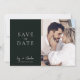 This modern wedding save the date card template with a tropical leaves pattern and dark green background features your photograph, names, and the wedding date.