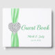 Elegant diamond heart with a green ribbon decorate this guestbook. Wedding guest books are fun for both the couple and their celebrants. Invite attendees to leave you well-wishes at your reception, and you're guaranteed to have a keepsake to look back on for years to come. Plus, your guests will get to leave their mark on your event, not to mention put in writing whatever they didn't have a chance to express in person on the big day. Personalize the book by changing the text in the fields provided. You can change font style, size, and color.