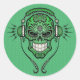 This elaborate DJ sugar skull design is decorated with intricate swirls and dot patterns. Headphones sit on top of the skull with two wires hanging below. A shadow falls onto the circular mesh background making it look like the skull is floating just above the surface. This aggressive Day of the Dead inspired image is perfect for musicians and music lovers.