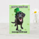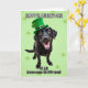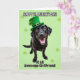 This greeting card features a black Labrador front and center, head tipped slightly as if leaning in close like a loyal friend. The dog wears an emerald green leprechaun hat with a small shamrock on the band, adding a lucky touch ☘️. Its dark, glossy fur stands out against a lime-green gradient background where faint shamrock shapes drift behind it. Amber eyes catch the light with a soft, affectionate look, and an open smile shows a pink tongue that makes the moment feel warmly shared 💚. Across the top, “HAPPY ST. PATRICK’S DAY!” appears in dark, high-contrast lettering, easy to spot at a glance. Near the lower area, “TO AN Awesome Girlfriend” is set in a matching dark tone, tucked neatly beneath the portrait without covering the face. The background keeps the focus on the dog, with pale shamrock silhouettes scattered from edge to edge in gentle layers.