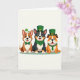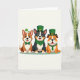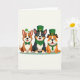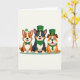 This card shows three friendly cartoon dogs lined up side by side on a softly lit, simple background, as if they’ve gathered for a photo together 💚. The left pup is a corgi-like dog in warm brown and cream, wearing a green bow tie and two little shamrocks perched above its head ☘️. In the center, a sleek dark-furred dog wears a green top hat with a gold buckle and a matching green bandana, leaning in with an easy, buddy-to-buddy closeness. On the right, a stocky bulldog in orange and white sports another green top hat and a neatly tied green necktie, its smile aimed toward the others like it’s in on the joke. Their big glossy eyes and open-mouthed grins create a sweet, affectionate energy, like close friends sharing a lucky-day moment. Near the top, St. Patrick’s Day greeting text sits in bright green, standing out clearly against the pale backdrop. The lighting stays flat and bright so the edges of the hats, ties, and bandana look sharp, with the trio centered in a horizontal row.