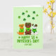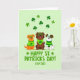 This card shows three friendly dogs lined up close together, their heads slightly tilted toward one another like they’re sharing a private joke 💚. The background is a soft light green with small three-leaf clovers drifting around them, setting a St. Patrick’s Day scene. On the left, an orange-coated pup wears green glasses and a bright green sweater with a shamrock on the chest, leaning in toward the others with an easy, affectionate look. In the middle, a chocolate-brown dog sticks its tongue out a bit and wears green glasses plus a green bandana marked with a shamrock, adding a flirty, buddy-buddy energy. On the right, a white dog with brown patches wears matching green glasses and a green-and-white striped jumper, posed as if it’s happily included in the group ☘️. Below the dogs, the phrase “HAPPY ST. PATRICKS DAY!” appears in large green letters, with “STEP DAD” placed underneath as a smaller add-on in the same green. The green accessories repeat across all three pups, and the clovers float behind them in the pale green space.