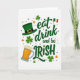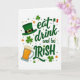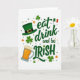 This greeting card centers on the phrase “eat drink and be IRISH,” with the first words in flowing emerald lettering and “IRISH” in larger, darker green capital letters for extra punch 💚. A small shamrock replaces the dot over the “i,” tying the message into the holiday in a sweet, flirty way ☘️. In the upper left, a green leprechaun hat with a shiny gold buckle tilts as if it’s been set down by someone mid-celebration. The lower left holds a sturdy mug of amber beer capped with creamy foam, like an open invitation to clink glasses with a close friend. The background stays bright white, letting the greens, warm oranges, and soft cream highlights stand out clearly. Tiny confetti-like dots and small flower shapes scatter around the lettering, giving the layout the look of a lively party table. In the upper right, a small Irish flag appears, balancing the hat and beer on the opposite side of the design and adding a final pop of color. Share St. Patrick's Day sentiments with someone you care about.