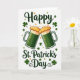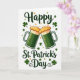 This greeting card shows two illustrated beer mugs filled with green brew and topped with a golden, foamy head as they clink together like close friends toasting side by side 💚. Their warm orange glass and tiny highlights make them look lively against a white background, and the slight tilt toward each other suggests an easy, affectionate cheer. Curving around the mugs is the phrase “Happy St. Patrick’s Day” in deep emerald lettering, placed prominently near the top and sweeping down to frame the center. Small four-leaf clovers float around the scene, adding lucky accents that feel like they’re drifting through the air ☘️. Green and orange dots are sprinkled throughout like confetti or fizzy bubbles, giving the layout motion without crowding the main image. The colors stay mostly green, orange, and gold, keeping the focus on the toast and the lucky symbols around it. Clovers and dots appear in different sizes, scattered across the white space around the mugs and along the edges of the design.