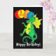 A colorful birthday card for a 5 year old with a green and yellow dragon, carrying balloons, on a black background, from a watercolour painting by Judy Adamson. The greeting on the front is 'Happy Birthday' in white lettering and the inside is left blank for your own message.