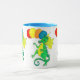 A colorful mug with green and yellow dragons, carrying balloons, from a watercolour painting by Judy Adamson.