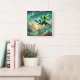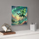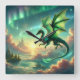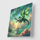 A majestic green dragon soars through a mystical, cloud-filled sky, leaving a trail of glowing light.