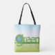 A globe in the word green forming green earth world. This design looks really effective on this Tote Bag