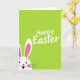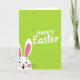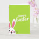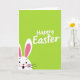 This greeting card features a bright spring-green background that looks like fresh grass stretching across the whole front. Near the top center, the words “Happy Easter” appear in smooth white lettering, standing out clearly against the green. From the bottom-left corner, a white bunny peeks in with tall upright ears, the inner ear shaded a soft pink 🐰. The bunny’s rounded cheeks carry a gentle blush, and its wide dark eyes and open smile give it a friendly, welcoming look, like it’s greeting someone it cares about. A small red heart-shaped nose adds a sweet touch, with a hint of pink tongue visible inside the mouth. Thin black whiskers arc outward, and the partial peek-from-the-corner pose makes the bunny feel like it’s sharing a private hello 🐇. The upper half stays mostly open and airy, while the bunny’s face anchors the lower-left with white, pink, and red accents against the green field.