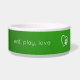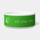 The design has a sleek 'eat, play, love' theme, symbolizing the joy of pet ownership. The background features a cool, modern green gradient that ranges from medium to bright green. Whether they're eating their dog food or drinking water, this durable, high-quality dish makes a delightful pet accessory for any home. It's a thoughtful dog mom or dog dad gift for birthdays, holidays, or any special day.