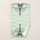 Add a touch of Paris to your bath with this unique Green Eiffel Towel Flourish Towel Set. Towel set design features a vibrant wavy background with the Eiffel Tower adorned with elegant flourishes and space to personalize with your name. Additional colors available with this design as well. Please contact me directly if you need assistance with personalization.