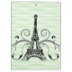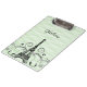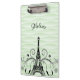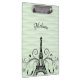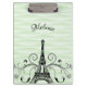 This Green Eiffel Tower Flourish Clipboard features a design of a the Eiffel Tower adorned with elegant flourishes against a green wavy background. Additional colors available with this design as well. This item may be personalized with a name, monogram, or favorite saying of your choosing. Please contact me if you need assistance with personalization.
