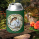 Can cooler featuring your custom photos on front and back, framed by circle in gold with green. Beautiful as a wedding gift or keepsake and customizable for any other occasion.