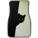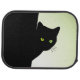 Sly black cat with emerald green eyes looks out from behind black wall into a green room.