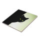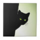 Sly black cat with emerald green eyes looks out from behind black wall into a green room.