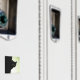 Sly black cat with emerald green eyes looks out from behind black wall into a green room.