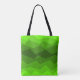 This tote bag has a geometric design of five shades of green running horizontally.