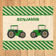 This design features two cute farm tractors with green and beige stripes border. Customize it with your name.