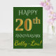 This simple, personalized wedding anniversary greeting card design features the message "HAPPY 20th ANNIVERSARY", with the "20th" having a faux gold-like appearance. The front also features a personalized name, and a green background. The inside features a customized wedding anniversary greeting message. It could be given to a husband or a wife in celebration of the couple’s twentieth wedding anniversary. [~Z0000086]