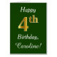 This simple birthday card design features the message "Happy 4th Birthday", with the "4th" having a faux gold-like appearance. It also features a personalized name, and a dark green background. It could be given to somebody who is celebrating their fourth birthday.