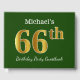 This guest book design features the ordinal number "66th" with a faux/imitation gold-like appearance. It also features a custom name, and a green colored background. It could be used at a party for somebody celebrating their sixty sixth birthday. [~Z0000056]