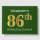 This guest book design features the ordinal number "86th" with a faux/imitation gold-like appearance. It also features a customized name, and a green colored background. It could be used at a party for somebody celebrating their eighty sixth birthday. [~Z0000056]