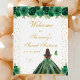 This elegant and glamorous birthday party napkin features a beautiful princess with brown red hair and fair skin in a green ball gown. The text combines handwritten script and modern sans serif fonts for a classy and sophisticated look. The floral arrangements, butterflies and gold confetti create the perfect blend of rustic and chic.