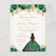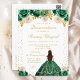 This elegant and glamorous Quinceañera birthday invitation features a beautiful princess with dark hair in a tiara and green ball gown. The text combines handwritten script and modern sans serif fonts for a classy and sophisticated look. The floral arrangements and gold confetti create the perfect blend of rustic and chic.