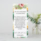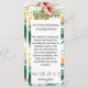 This welcome card for visitors doubles as a wedding program. Both sides of the card have a green floral pattern. The front of the card features the couple's welcome greeting for guests, while the back features a simple picture timeline of the wedding.
