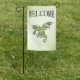 Flag bracket is super easy to assemble. There is a prong fork that goes into the ground. I dug a shallow hole to bury the prongs and still had enough height. Reinforced stitching on for the flag opening. Colors are true to the website. Mona Lisa's sign with the text is easy to read, the text is clear and not blurry.