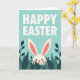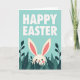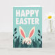 Designed with a bright aqua background, this card opens with rounded white sans-serif text placed along the top edge, clearly announcing an Easter greeting. Below the lettering, a creamy white bunny 🐰 with long upright ears peeks out from a thick cluster of stylized leaves. The inner ears are a soft pink, and the bunny’s small dark eyes and slight smile give it a gentle, friendly look, like it’s shyly greeting someone it cares about. Rosy cheek patches and a tiny red nose add a sweet, affectionate touch without needing extra decoration. The foliage around it mixes deep emerald and teal tones, framing the bunny’s face like a cozy hiding spot in a spring garden 🌷. Light, even shading keeps the illustration flat and smooth, with simple shapes and clear edges throughout. The leaves form a dense border across the lower half, while only the bunny’s head and ears rise above the greenery.