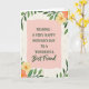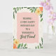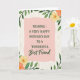 This card features a soft pink, wavy-edged rectangle centered like a gentle sign, surrounded by leafy green branches and small blossoms that lean inward as if offering a quiet embrace ❤️. The main message sits in the middle in dark green, with the first lines in a classic serif style and a final phrase in a flowing cursive look for a tender contrast. The text is centered and evenly spaced, giving the words room to breathe against the blush background. Around the panel, layered leaves in several shapes curl and overlap, creating the feeling of closeness you’d see between dear friends standing shoulder to shoulder. Warm yellow and soft peach flowers are tucked between the greenery, their petals painted with a light, watery texture that feels gentle and romantic 🌼. Behind everything, a creamy backdrop shows a faint wood-grain pattern that adds a cozy, natural setting without stealing attention. The border forms an airy frame with clusters of foliage at the sides and corners, and the blossoms appear in small groups near the top and lower edges of the pink panel. The dark green lettering sits crisp against the pink center, while the cream background keeps the leafy frame and pastel flowers softly in view.
