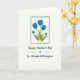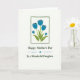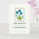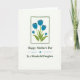 This greeting card features a calm floral illustration centered inside a slightly uneven deep forest-green rectangular frame. Five blue blossoms rise together on rich green stems and leaves, leaning close as if in a gentle, affectionate huddle ❤️. Each petal is filled with smooth blue color, with small darker blue square touches near the tips that hint at budding detail. The white background keeps the scene airy and open, letting the blue flowers and green foliage stand out clearly. Beneath the framed flowers, the message “Happy Mother’s Day” appears in dark green flowing lettering, centered on the page. A small blue star-like mark sits below with two wavy lines on either side, leading the eye down to “To a Wonderful Daughter” in matching dark green text 🌼. The layout is balanced, with the framed bouquet above and the stacked lines of text below on a bright white field.