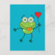 Green leggy frog with funny bulging eyes and big head while smiling generously, walking unsteadily, sticking its tongue out, holding red heart balloon and feeling madly in love