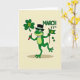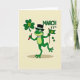 This greeting card shows an upright, humanlike frog in rich green tones, posed as if mid-step on a warm beige background, giving the scene a friendly, flirty energy 💚. The frog wears a black top hat with a thin green band and a neat white bow tie, looking dressed up as though it’s headed to meet someone special. In its left hand it holds a bright red baton, angled forward like it’s leading a little parade for a friend. In its right hand, it waves a green flag marked with a golden Irish harp, adding a proud St. Patrick’s Day touch ☘️. A large shamrock sits near the upper left, echoing the Irish theme and balancing the frog’s raised arm. The text “MARCH 17th” appears near the top in emerald green, set above two smaller shamrocks. The frog’s lifted leg, the tilt of the hat, and the crisp contrast of green, black, white, red, and gold stand out clearly against the soft beige field.