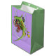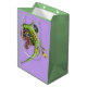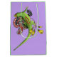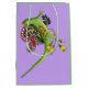 A green gecko with red markings is on a tribal black, red and white tribal design in backdrop of purple
